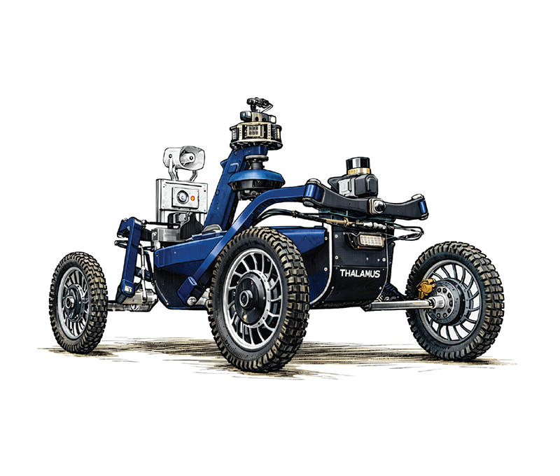 Pour la partie terrestre, leur principale solution est le Thalamus : un robot autonome de sécurité et de sûreté, une solution spécialement conçue pour la sécurisation des espaces sensibles. Son autonomie, sa mobilité et ses capacités de détection et d’analyse en font une technologie unique en son genre.